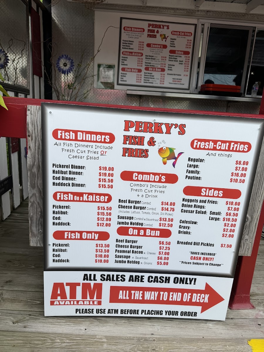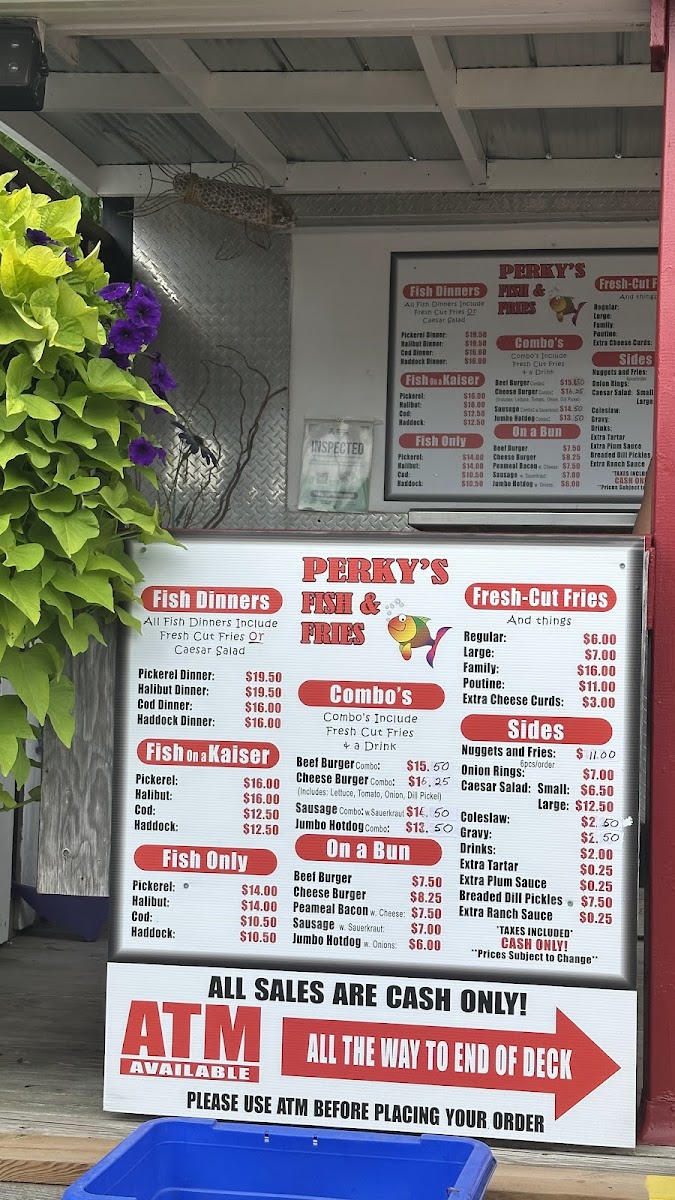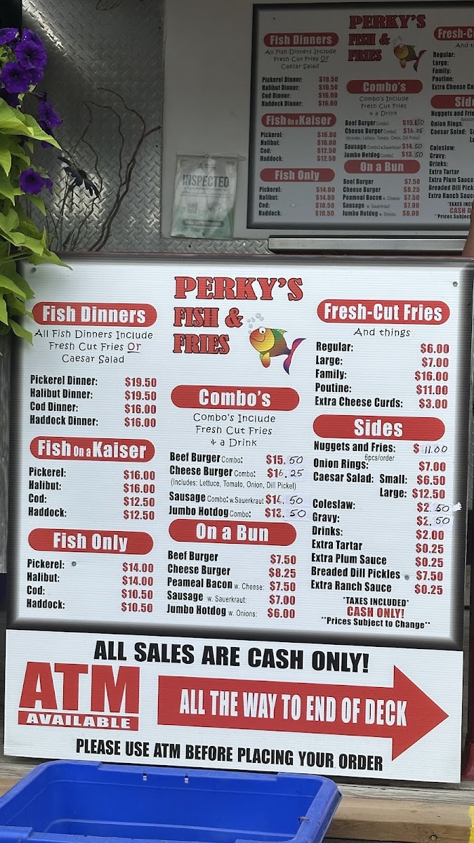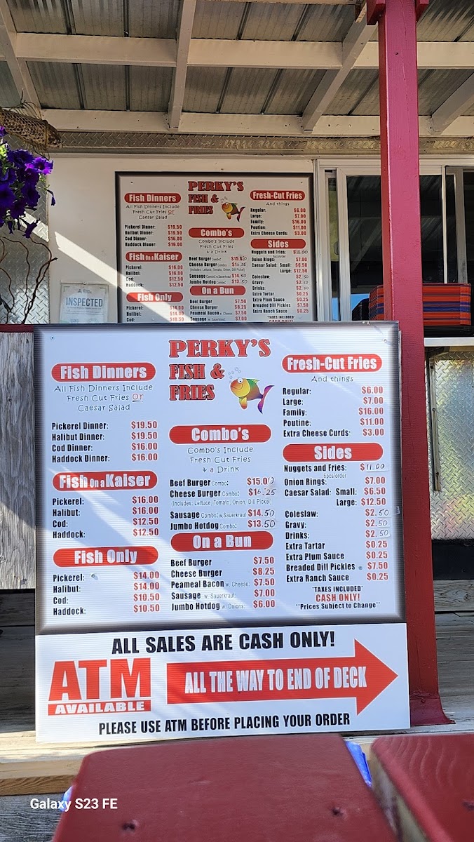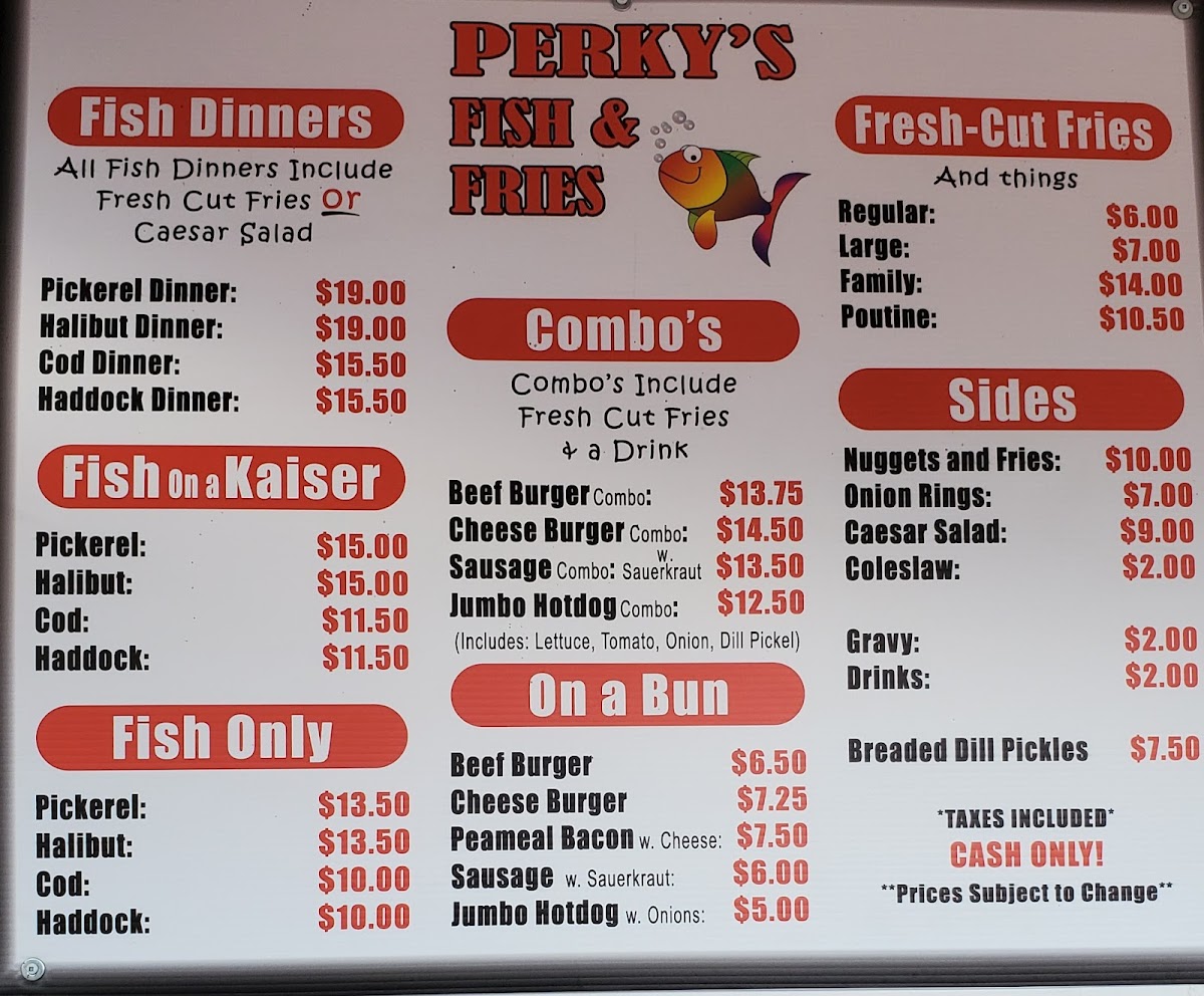 Perky's Fish & Fries offers a varied and tempting menu perfect for satisfying any craving. For those craving a hearty meal, the Beef Burger Combo, Cheese Burger Combo, and Sausage Combo are delicious choices, with each combo likely including a side and drink, although specific prices aren't listed. Their Jumbo Hotdog Combo is also a classic option. If you're in the mood for a snack or side dish, they offer Nuggets and Fries, crispy Onion Rings, a fresh Caesar Salad, and creamy Coleslaw. For a lighter bite, you can go for one of their sandwiches on a bun, like the juicy Beef Burger, Cheese Burger, or Peameal Bacon Sausage. They also offer a Jumbo Hotdog for those looking for a simple yet satisfying option. Fish lovers will appreciate their Pickerel, Halibut, Cod, and Haddock, available both as single servings or in full Fish Dinners such as the Pickerel Dinner, Halibut Dinner, Cod Dinner, and Haddock Dinner. And for those who can't get enough cheese, there are Extra Cheese Curds available to elevate any meal. Whether you're in the mood for a classic burger or some fresh fish, Perky's offers something for everyone.